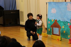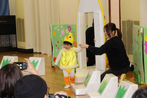たくさんのお客さんが見ているので、びっくりして泣いてしまったり、おうちの人が見えると「パパー」と泣いてしまう子もいましたが、先生に名前を呼ばれると、とっても上手にお返事ができました。