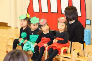 月齢で2つのチームに分かれて発表をした、2歳児 さくらんぼ組さん。