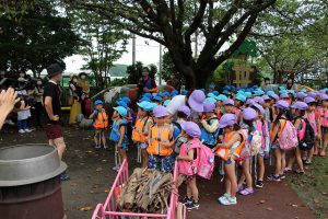 宿泊できない事は大変残念で、苦渋の決断となりましたが、できる時間内でめいっぱい楽しもう!と、年長の担任をはじめ、職員全員の思いが詰まった1日が始まりました!!