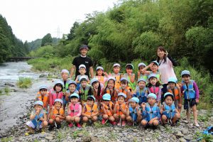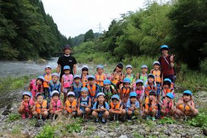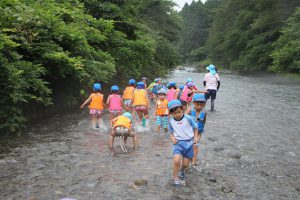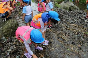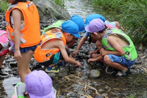 幼稚園に集合して、すぐに川遊びの準備。
