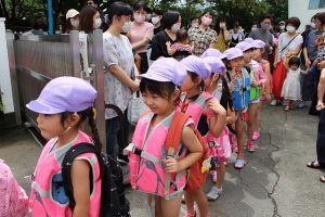 おうちの人と笑顔で別れいよいよ出発です。