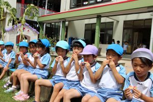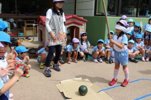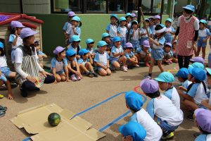 年長さんは、園庭ですいか割りを楽しんでいました。
