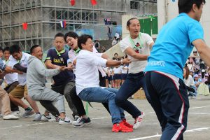 幼稚園と富丘保育園の保護者が、学年ごとチームに分かれての綱引き。