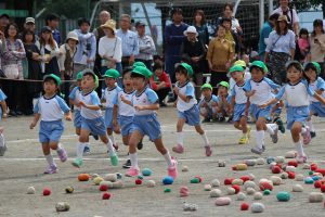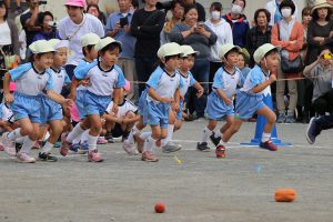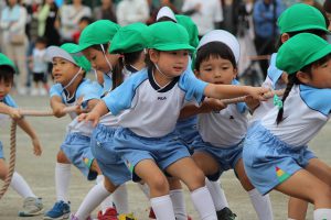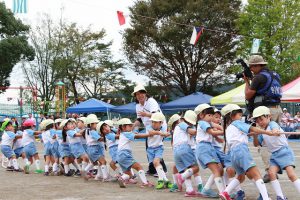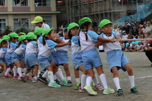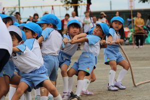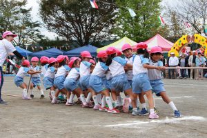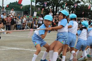 力強い、保護者による綱引きを応援した後は、子ども達の出番!