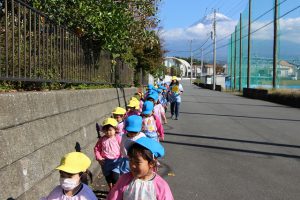 年少、年中、年長さんは歩いてわんぱく農場まででかけます。