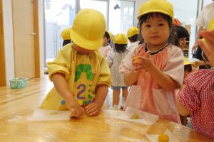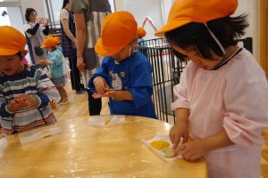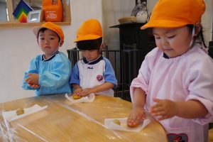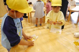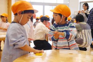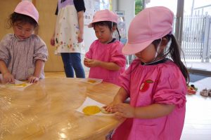 クッキー作りで、年少さんが体験したのはクッキーの形作り。
