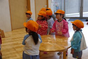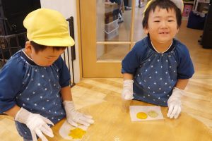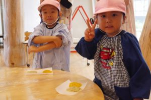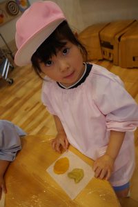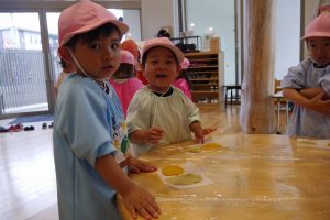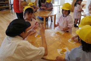 本日は、その第一回目“野菜クッキー作り”を年少さんが行いました。