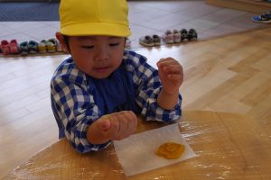 今日のクッキー作りの導入とし、各クラスでは粘土遊びを楽しみ、どんな形のクッキーにするか?話をしながら行ってきました。