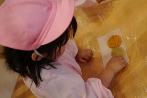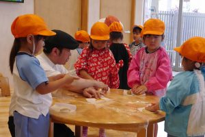 クッキーの生地は、給食室で食育プログラムを行ってくれる、ミールケアの先生が作ってくださり、一人分の量に丸めた物で、子ども達が形をつくっていきました。