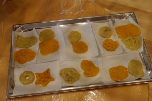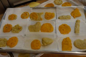 その後見せてもらった、クッキーの生地は、かぼちゃはオレンジ、さつま芋はきいろ と野菜と同じ色をしていました。