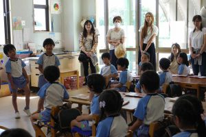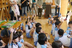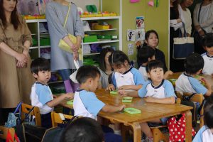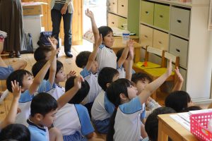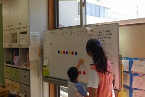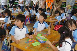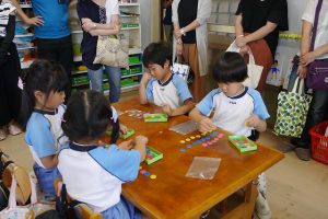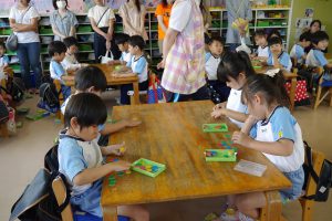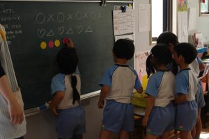 並んだおはじきをみて、どのような順序で並んでいるのか?みんなで考えて、その法則を発見し、次は何色のおはじきがくるのか?みんなの前で発表しあい、そのあとは自分たちのおはじきを使い、先生が並べたおはじきの順序を真似し、続きをどんどんつなげていくという遊びを行っていました。
