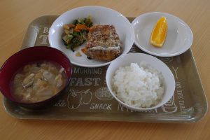 【ご飯 味噌汁 さばの竜田揚げ 小松菜と大根のおかか和え オレンジ 麦茶】