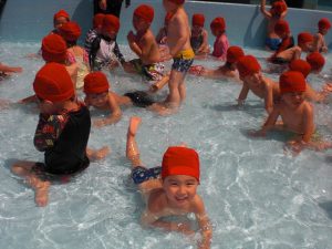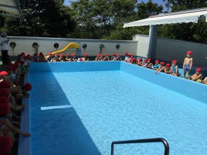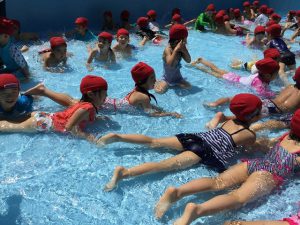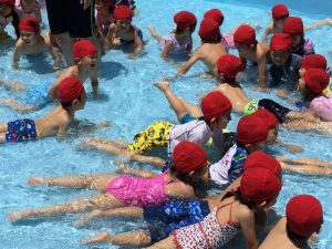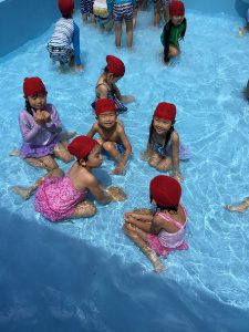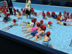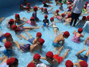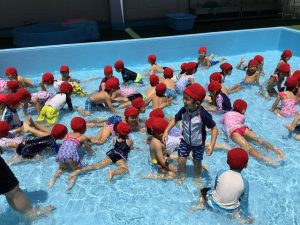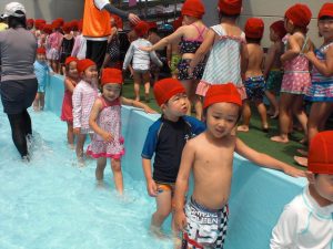 年中さん、年長さんは、今日から始まるプールをとても楽しみにしていて、大きなプールにも、