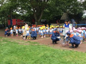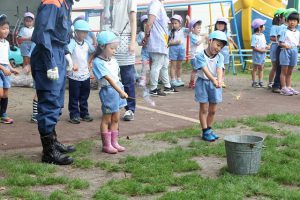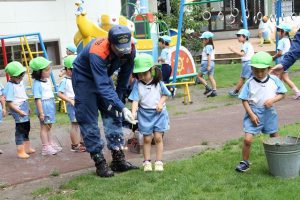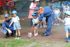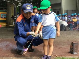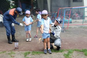 富士宮西消防署の方が園に来てくれて、正しい花火の遊び方について教えてくれ、