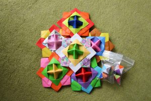 すてきな贈り物【7月19日】 2019 7/19 2019.07.19 7月19日(金) 本日、リーチェルに突然お客様がいらっしゃり 「子供達にあげて下さい。」 と、素敵な贈り物を頂きました。 何かと見てみると・・・ 色とりどりの折り紙でおられた、素敵なコマやサイコロがたくさん! 本日、子ども達が持ち帰ります。 花火教室【7月2日】 食育プログラム『も~ぐもぐDay』③