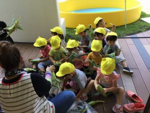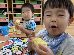 甘くてとっても美味しいトウモロコシが出来上がり、とっても満足げなさくらんぼ組の子ども達でした。