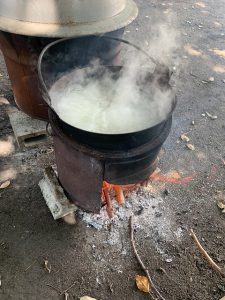 理事長先生が、園庭でかまどを利用して、お湯を沸かしてくれたので