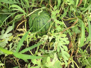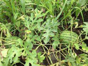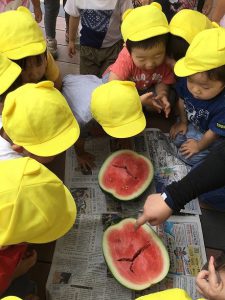 収穫したスイカをみんなでコンコン♪叩いて確認。