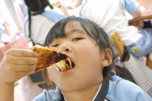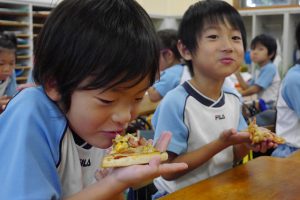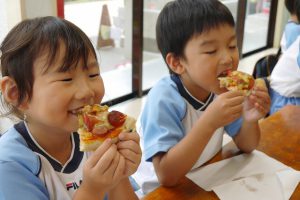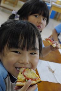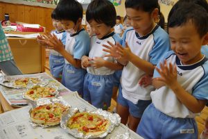みんなで作ったピザを、にこにこ笑顔でほおばる姿を見ただけで