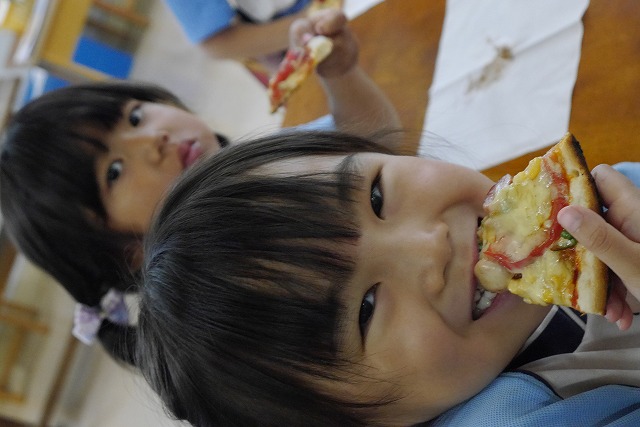 みんなで作ったピザを、にこにこ笑顔でほおばる姿を見ただけで