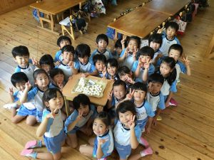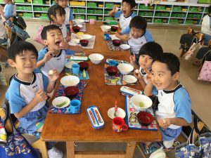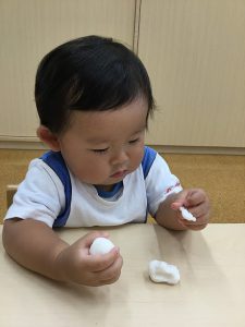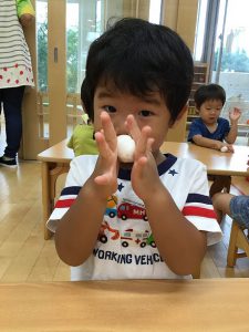 幼児組さんは、砂糖を混ぜてお団子を作り、飾りとは別にお団子を丸め、一人一つずつお団子を食べました。