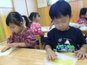 2歳児 さくらんぼ組さんが、さつまいものクッキー作りを行いました。