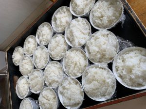 ラップをつけた茶碗によそり、子ども達がおにぎりを握れるように準備します。