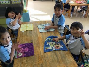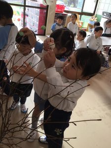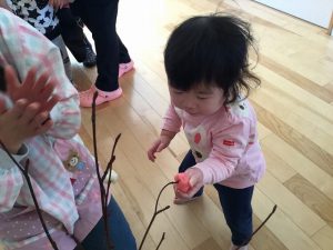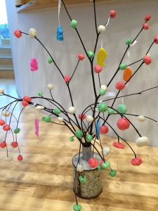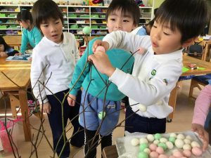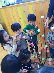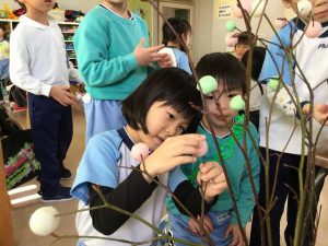 幼児さんは、各クラスごとにまゆ玉を飾り、乳児さんは、3クラスでひとつのまゆ玉飾りを飾りました。