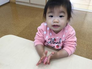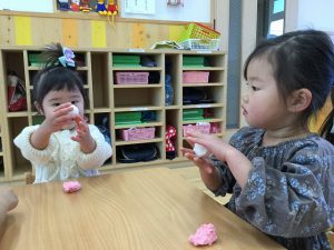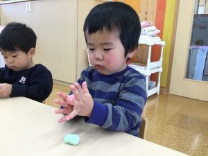あらかじめ上新粉を練ってもらい、子供たちはそれをころころ手の中で転がして丸めていきます。