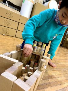 つみきのそのさんと遊んでから、お部屋でのつみき遊びの様子が今までと少し変わり、つみきのそのさんと一緒に遊んだドミノを楽しむ姿、ピタゴラスイッチみたいにして遊ぶ姿などが見られ、本当に楽しかったんだな~と遊びこんでいる姿を見てとてもよく感じました。