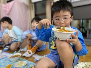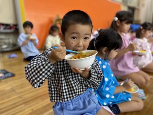リーチェルディスタンスを守り、園児との間隔を空けて全員前を向いてのカレーパーティーとなりましたが…