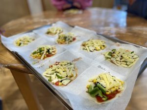 幼稚園で採れた夏野菜、ナス・ピーマン・トマトに、チーズとコーンを足してピザ作りをしました。