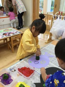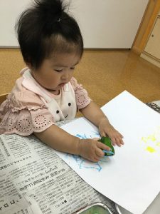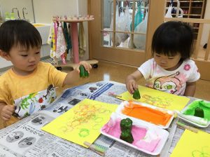 幼稚園の畑で採れた夏野菜を使って各クラス野菜スタンプもしました。