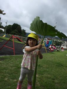 幼稚園の畑で育てている里芋の葉っぱ。みんなの背より大きくてビックリ!本物の傘みたいでしょ?