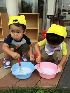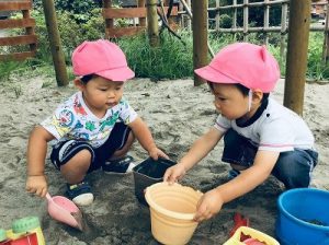 お砂場で楽しそうにお仕事中。お砂場は子ども達みんなのお気に入りの場所。ひんやり気持ちいい