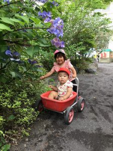 0歳児のお友達を乗せて園庭探検。上手に押して幼稚園を案内しています。