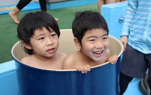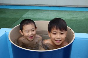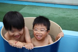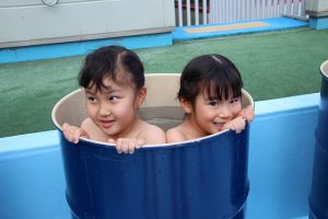 と、園長先生が屋上プールまで運んで準備して下さいました。