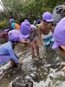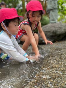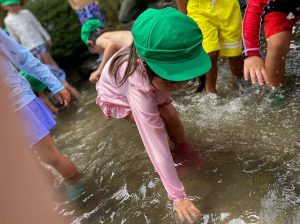 昨年、一昨年と経験をしている年中・年長児は、魚の動きをよく見て、腰をかがめ、狙ってつかまえることができます。