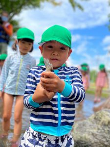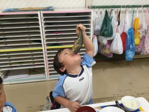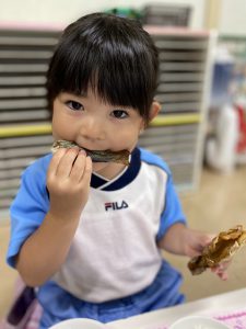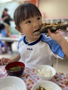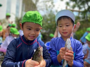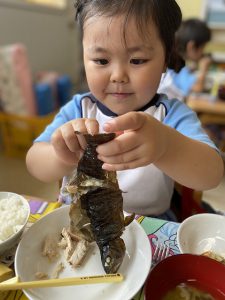 手で触って、捕まえた時と焼いた後の魚の感触の違いを感じたり、手についた魚のにおいに気が付いたり。子どもたちは五感をフル稼働していました♡