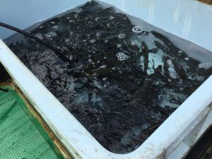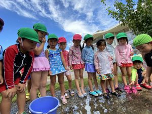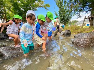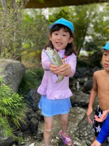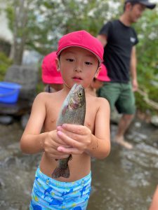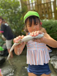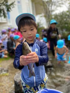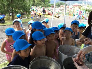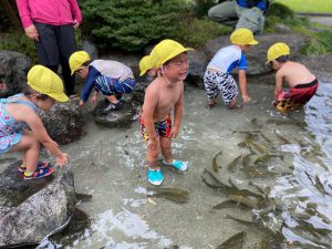 リーチェル幼稚園の、夏の恒例行事となった「ニジマスのつかみ取り」