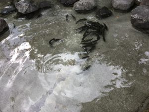 生きのいいニジマスが、足の間を素早く泳ぐと、くすぐったくて、ぞわぞわします!