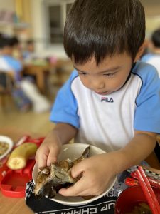 「命をいただくということ」「いただきますの意味」を子どもたちなりに感じます。