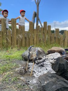 香ばしいにおいが園庭に広がると、乳児さんも興味深々♡