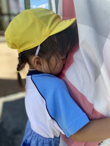 大好きな担任の先生にくっついて泣いている年少児の姿は、微笑ましく、勇敢に見えました。