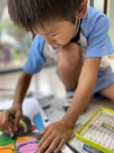 年長児の、1人1つの机での生活も落ち着いて過ごせるようになってきました。