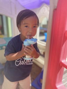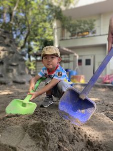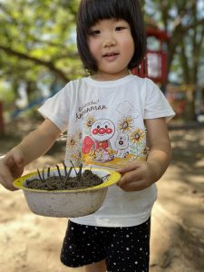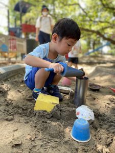 お母さんと一緒に砂場で料理をしたり、お山を作ったり、おうちの中で休憩したり