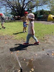 年少児がスプリンクラーで水遊びを始めると、一緒にびしょ濡れになって遊ぶ子もいます。