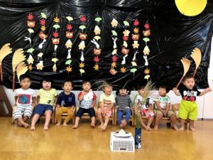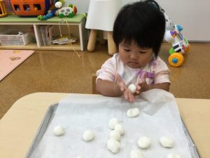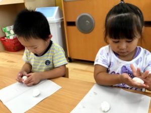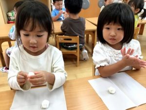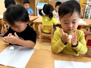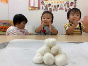 昨日、乳児組も幼児組も、各クラスでお月見団子を作りました。