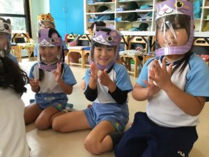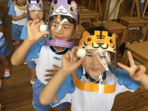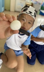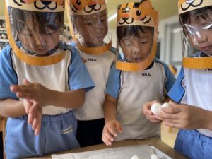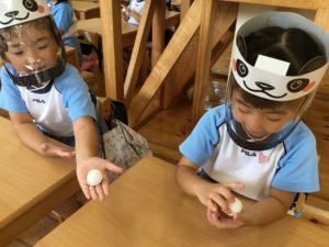 幼児組は、ご厚意により頂いたフェイスシールドをつけてお団子を作りました。