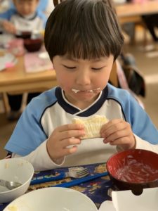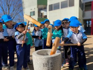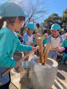 お餅つきも行いました。今年は食べれませんでしたが、年長児が順番について・・・